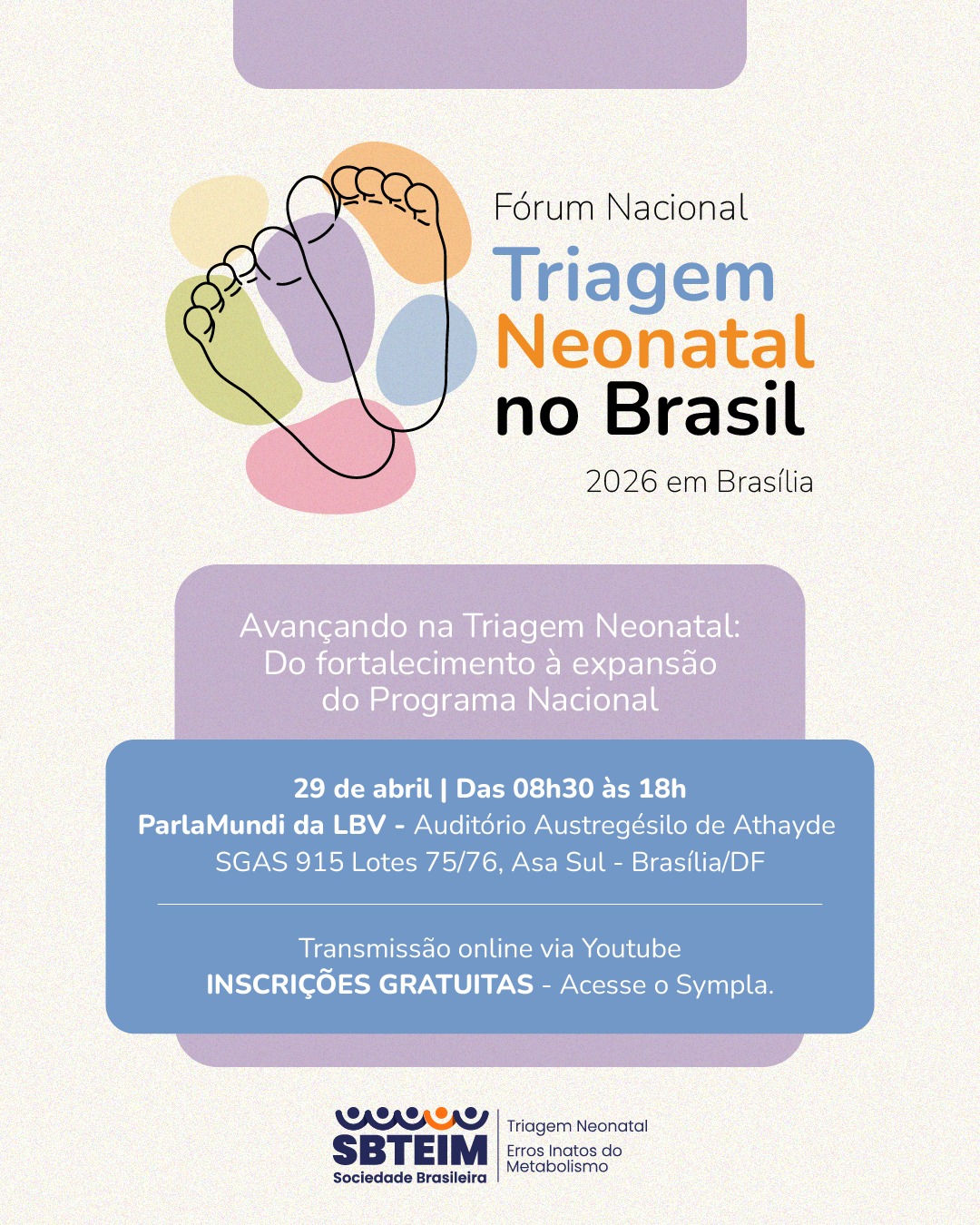 A Sociedade Brasileira de Triagem Neonatal e Erros Inatos do Metabolismo – SBTEIM promoverá o I Fórum Nacional sobre Triagem Neonatal no Brasil, com o tema: “Avançando na Triagem Neonatal: do fortalecimento à expansão do Programa Nacional”, no dia 29 de abril, das 8h30 às 18hs, no ParlaMundi da LBV, em Brasília/DF.